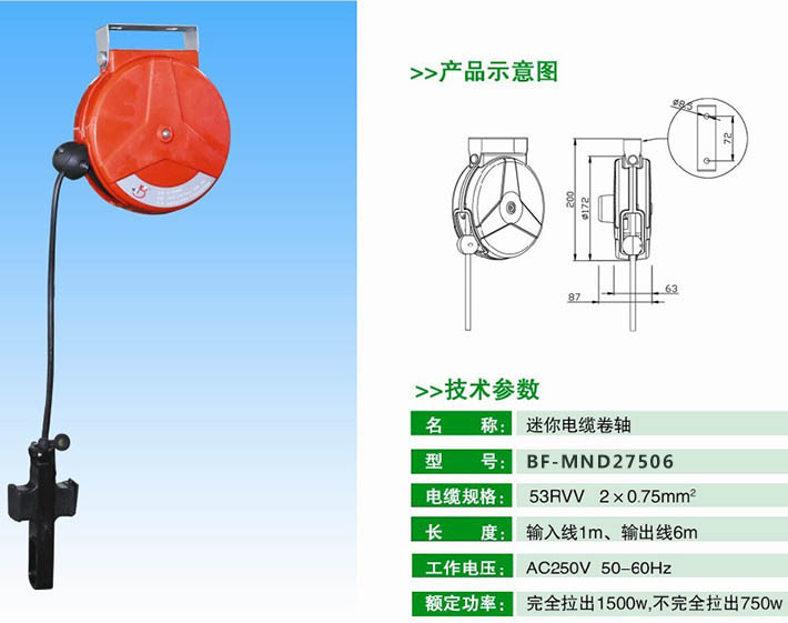 额定功率:不完全拉出3A ,完全拉出:8A,额定电压:220V AC 频率:50-60Hz 电缆线规格:2x0.75mm2输入线长度:1M,输出线长度:6M 产品外壳颜色可选:灰、蓝、黄、红色。 |