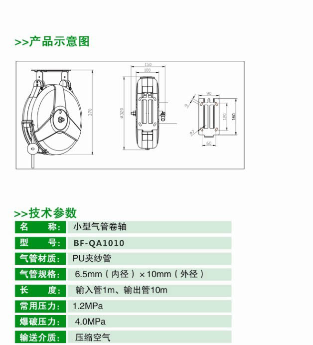 BF-QA1010 | 常用压力1.5MPa,爆破压力:4.5MPa ,可输送介质:压缩空气,管规格6.5mm×10.0mm×10M,材质:PU夹纱管,产品外壳颜色可选:灰、蓝、黄、红色。(可做:8.0mm×12.0mm×15M,10.0mm×14.0mm×10M) | ||||