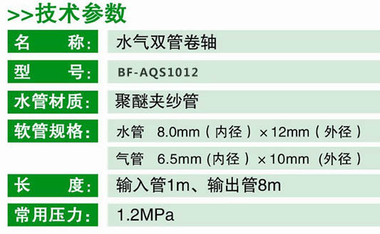 常用压力1.2MPa, 爆破压力:3.6MPa 水管规格8.0mm×12.0mm(过常压水) 气管规格6.0mm×10.0mm(过压缩空气) 全长7M |